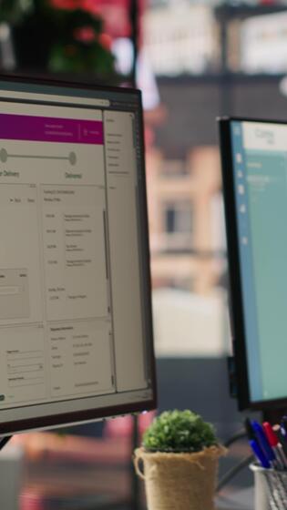 verticale pacchetto puntamento Software e crm appuntamento programma App visualizzato su pc schermi nel la logistica Dipartimento. computer viene visualizzato nel ufficio mostrando pacchi spedizione monitoraggio e fogli di calcolo Video Pro