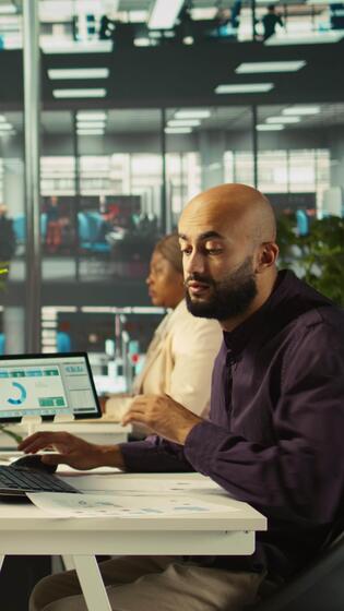 verticale dipendente la modifica documenti su del desktop computer a ufficio scrivania, in aggiornamento rapporti e File. lavoratore analizzando dati grafici su computer schermo a scrivania, interpretariato statistico informazione, telecamera B Video Pro