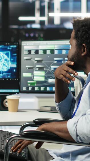 verticale Admin nel sedia a rotelle e dati centro collaboratore Lavorando insieme utilizzando ai nodo albero Software per minimizzare tempi di inattività. server centro esso esperto nel invalidità e collega utilizzando visivo programmazione app, telecamera B Video Pro