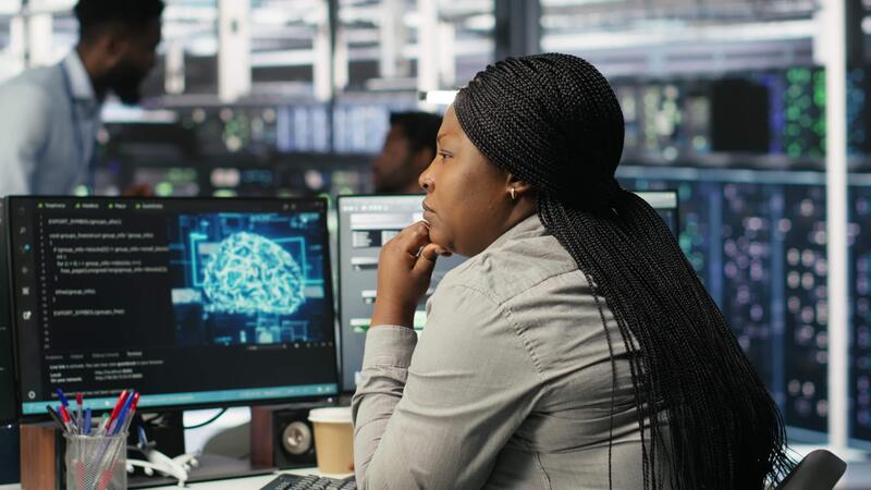 dati centro personale membro nel ufficio utilizzando ai in profondità apprendimento algoritmi per analizzare set di dati. africano americano donna nel server camera utilizzando artificiale intelligenza neurale reti, telecamera B Video Pro
