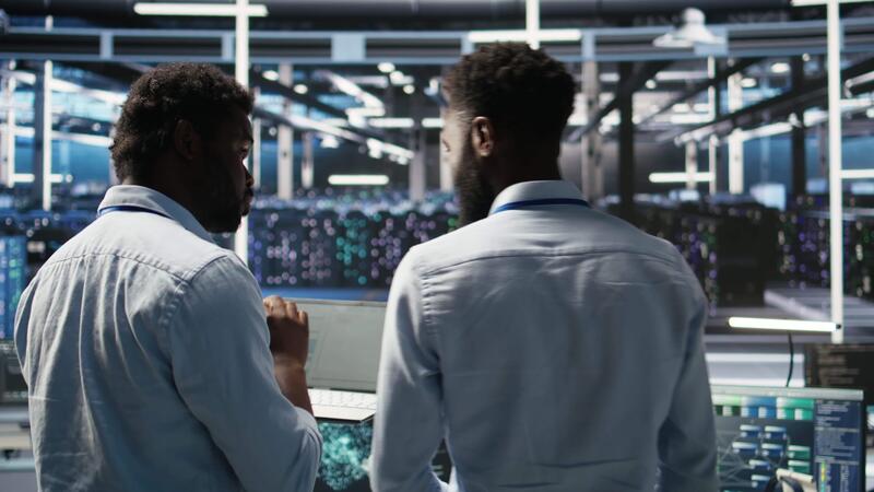 server centro ingegneria squadra interpreta dati analitica grafici. lavoro di gruppo dati centro colleghi utilizzando artificiale intelligenza programma mostrando predittivo sistema metrica, telecamera un' Video Pro