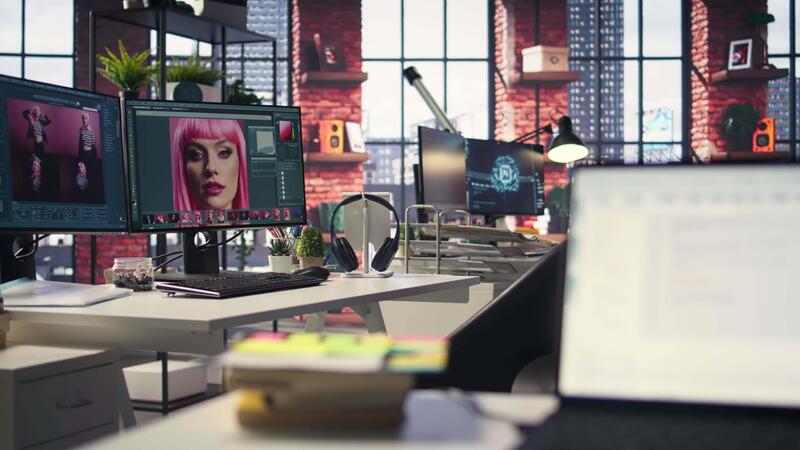 moderno creativo ufficio per un' foto editore con ai e ritocco Software, mostrando un vuoto scrivania con computer in esecuzione Avanzate design programma. artistico digitale media aggiustamenti. Video Pro