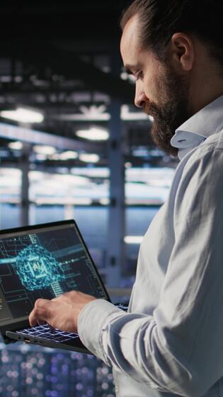 verticale tecnico Tenere il computer portatile a piedi su server azienda agricola piattaforma, fare ai macchina apprendimento automatizzazione. dati centro programmatore utilizzando taccuino, fare Manutenzione utilizzando artificiale intelligenza, telecamera un' Video Pro