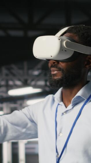 verticale dati centro Admin utilizzando vr cuffia per tenere sotto controllo neurale Rete ai sistemi. server camera dipendente utilizzando virtuale la realtà Tech per sorvegliare attrezzatura alimentazione macchina apprendimento processi, telecamera B Video Pro