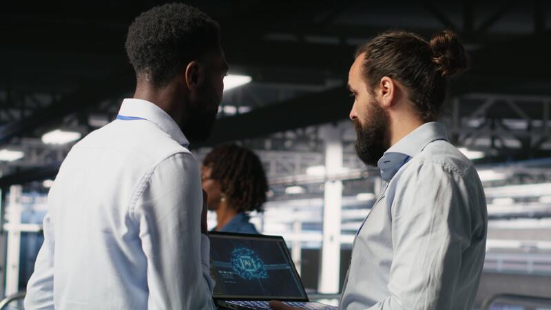 server azienda agricola collaboratori fare infrastruttura ai macchina apprendimento automatizzazione. dati centro computer scienziati collaboratore per mantenere server utilizzando artificiale intelligenza, telecamera B Video Pro