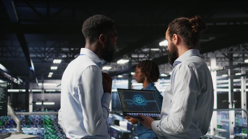 server azienda agricola collaboratori fare infrastruttura ai macchina apprendimento automatizzazione. dati centro computer scienziati collaboratore per mantenere server utilizzando artificiale intelligenza, telecamera un' Video Pro
