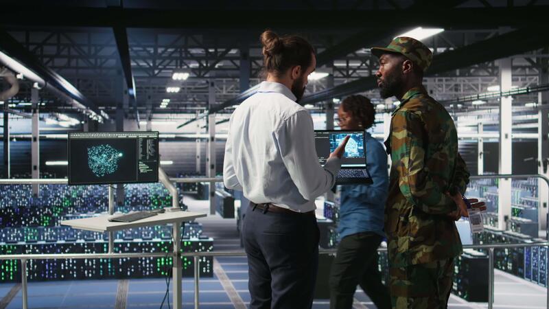 esercito tecnici nel comando centro server camera utilizzando artificiale intelligenza per individuare informatica minacce. militare dati centro esperti uso ai rivelazione Software per sicuro difesa sistemi, telecamera un' Video Pro