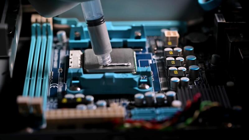 precisione applicazione di termico incolla su un' computer processore nel un' High Tech riparazione ambiente Video Pro