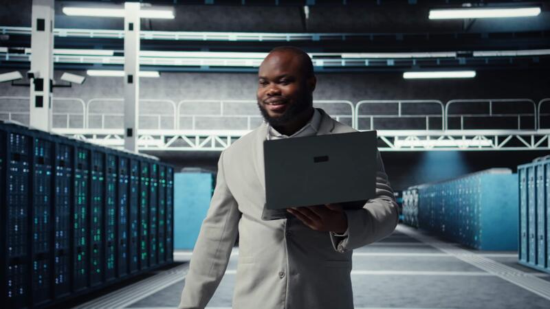 server camera lavoratore revisione sistemi per vulnerabilità utilizzando Software su il computer portatile. ingegnere a piedi nel dati centro fare backup e recupero protocolli utilizzando taccuino, telecamera un' Video Pro