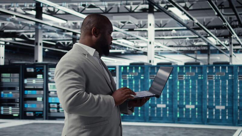 server camera infrastruttura ingegnere scripting automatizzato flussi di lavoro utilizzando Software su il computer portatile. dati centro programmatore in esecuzione predittivo Manutenzione scansioni utilizzando taccuino, telecamera un' Video Pro