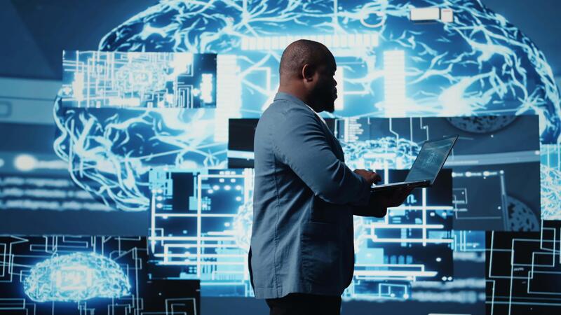 digitale concetto di africano americano ingegnere esplorando artificiale intelligenza, in mostra in profondità apprendimento algoritmi, alto Tech neurale reti e futuristico dati strutture. telecamera un. Video Pro