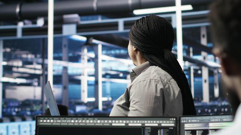 verticale dati centro Admin utilizzando il computer portatile per fare nodo albero programmazione, ottimizzazione risorsa assegnazione. donna nel server camera usi predittivo ai visualizzazione sistemi su taccuino per Manutenzione pianificazione, telecamera B Video Pro