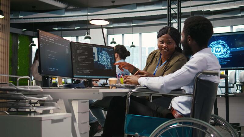 sorridente avviare ingegnere e collega con invalidità brainstorming, utilizzando macchina apprendimento tecnico. contento africano americano uomo nel sedia a rotelle e collaboratore nel ufficio utilizzando ai predittivo Modelli, telecamera un' Video Pro