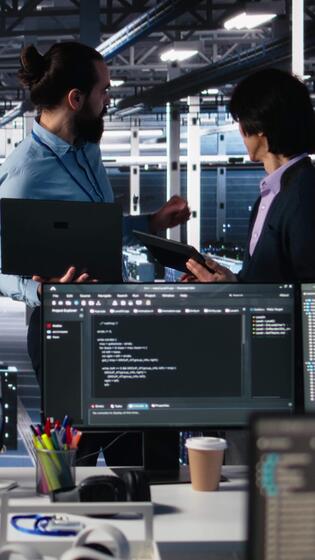 verticale dati centro manager supervisione opera fatto di programmatori Lavorando su neurale Rete Software. server centro supervisore supervisione esso personale membri implementazione in profondità apprendimento tecnologia, telecamera un' Video Pro
