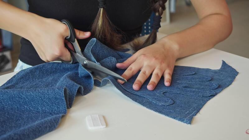 utilizzando un' paio di forbici, il sarto forme un' denim pezzo in un' simile a una palma modulo. Video Pro