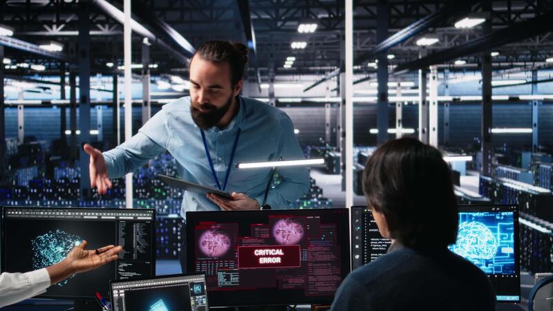 sistema amministratori nel dati centro lotta con computer bug mentre utilizzando ai. frustrato server azienda agricola collaboratori fare di brainstorming per fix sistema errori mentre utilizzando artificiale intelligenza, telecamera un' Video Pro