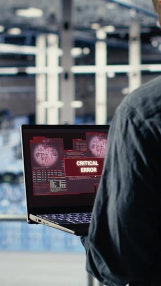 verticale ingegnere nel server camera riceve critico errore apparire su il computer portatile schermo, trattare con urgente sistema questioni. dati centro lavoratore prende notifica di hardware i problemi che colpisce prestazione, telecamera B Video Pro