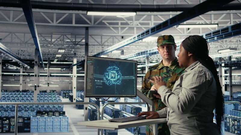 militare personale nel server camera usi ai utensili per Aiuto gestire computer sistemi. esercito squadra indossare uniforme recensioni informazione utilizzando artificiale intelligenza programmi nel server azienda agricola, telecamera un' Video Pro