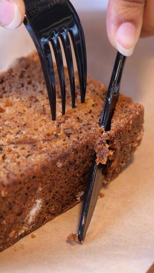 assaporando un' fetta di fatti in casa torta mentre utilizzando un' forchetta e coltello Video Pro
