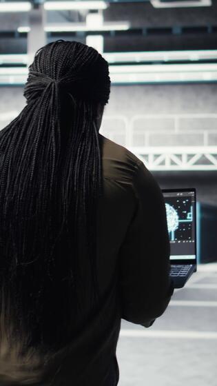 verticale ingegnere fare dati centro automazione utilizzando ai Software utensili su il computer portatile. server camera esso specialista attrezzi artificiale intelligenza guidato predittivo Manutenzione sistemi utilizzando taccuino, telecamera un' Video Pro