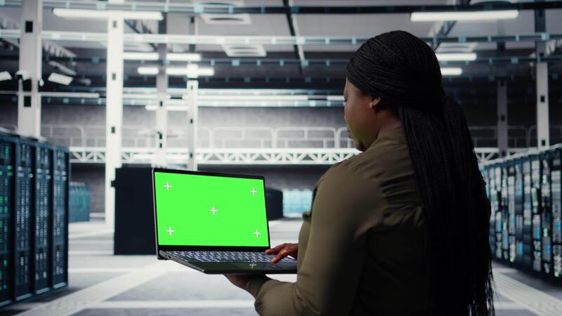 ingegnere a opera utilizzando verde schermo il computer portatile nel dati centro per dai un'occhiata hardware per sistema stabilità. lavoratore utilizzando modello taccuino per sorvegliare server azienda agricola e configure infrastruttura, telecamera un' Video Pro