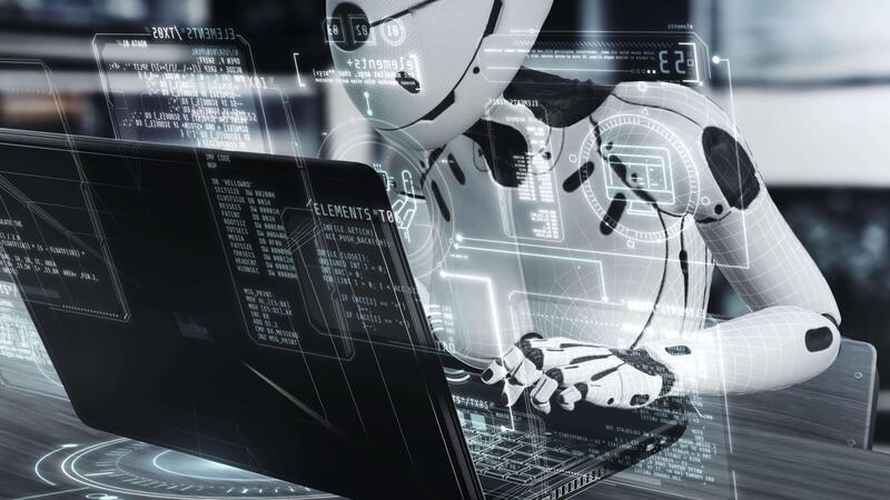 robot programmazione futuristico Software utilizzando un' il computer portatile e ologramma interfaccia Video Pro