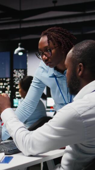 verticale Due nero lavoratori interagendo con un' virtuale assistente su computer a scrivania, risposte e inteligente automazione per Ottimizzare in linea comunicazione. dati guidato ai soluzioni. telecamera un. Video Pro