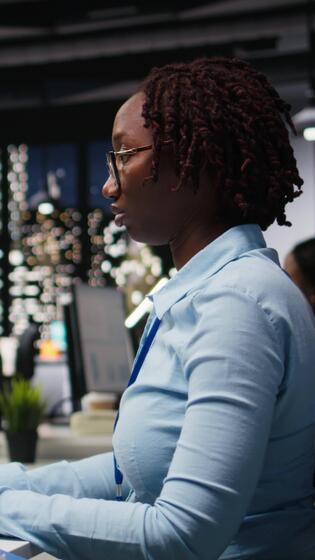 verticale ai assistente visualizzato su un' computer del desktop porzione nero squadra completare compiti in ritardo a notte, in profondità apprendimento per razionalizzare interazioni e migliorare ragnatela basato connettività. telecamera un. Video Pro