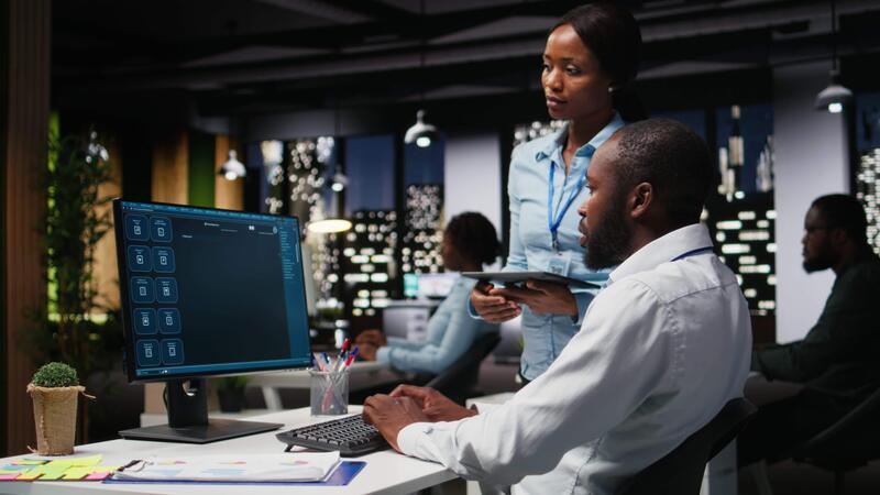 nero esso ingegneri squadra sviluppando App e Software algoritmo su pc, Lavorando nel il ufficio in ritardo a notte. specialisti uso digitale utensili e si concentra su copione ingegneria e codifica. telecamera un. Video Pro