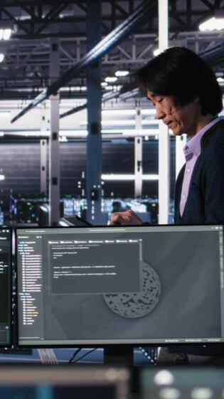 verticale squadra di ingegneri fare di brainstorming nel server camera utilizzando ai per revisione infrastruttura diagnostica. lavoro di gruppo esso colleghi nel dati centro analizzando dati utilizzando artificiale intelligenza, telecamera un' Video Pro