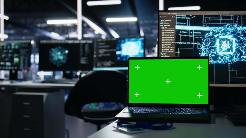 vicino su di modello taccuino nel dati centro supporto ai formazione flussi di lavoro e automazione di sistemi. isolato schermo il computer portatile nel server camera puntamento hardware in lavorazione in profondità apprendimento set di dati Video Pro