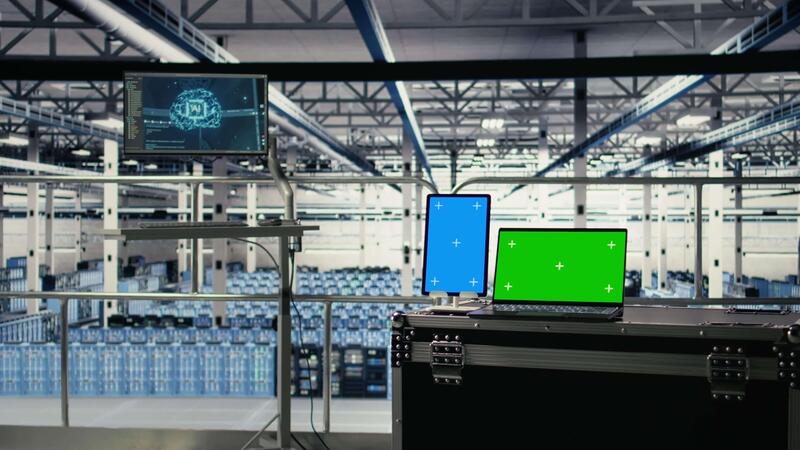 verde schermo taccuino e modello tavoletta nel industriale dati centro utilizzando artificiale intelligenza tecnologia. in profondità apprendimento Tech su isolato schermo dispositivo e croma chiave il computer portatile nel server camera Video Pro