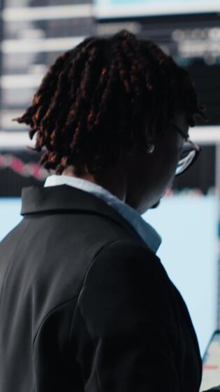 verticale manager utilizzando il computer portatile Software per confrontare azienda metrica su digitale videowall prima fabbricazione decisioni. imprenditore analizzando chiave prestazione indicatori utilizzando taccuino programma, telecamera B Video Pro