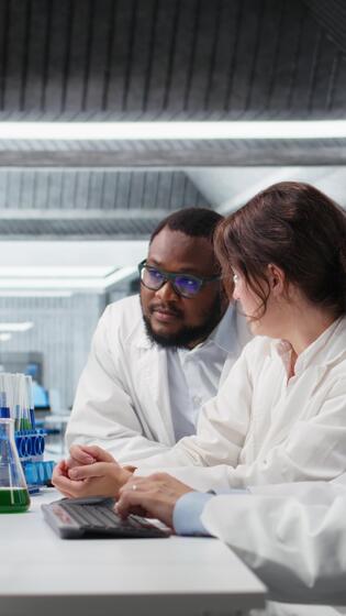 verticale multirazziale laboratorio tecnici a pc scrivania guardare a 3d molecolare modello. diverso nanotecnologie ricercatori utilizzando bioingegneria programma su pc nel medico laboratorio visualizzazione dna dati, telecamera un' Video Pro