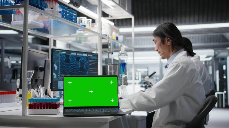 anziano scienziato utilizzando verde schermo il computer portatile Software nel laboratorio, guida trattamento scoperta. asiatico utilizzando bioinformatica applicazione su modello taccuino nel sterile laboratorio, telecamera un' Video Pro