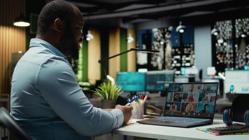 africano americano lavoratore frequentando un' a distanza ragnatela chiamata a scrivania utilizzando webcam su computer portatile, interagendo con stakeholder dopo ore. esecutivo assistente scambiare idee per networking sessione. telecamera un. Video Pro