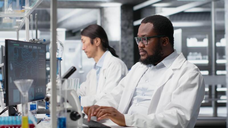 scienziato utilizzando computer programma per dna dati analisi nel laboratorio, fare brainstorming. laboratorio esperto pensiero, fare ricerca utilizzando bioinformatica genomica Software su pc, telecamera B Video Pro