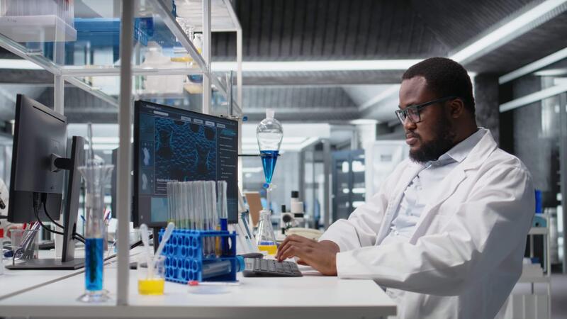 chimico ingegnere nel laboratorio ispezionando chimico composti nel fiale per purezza verifica utilizzando pc Software. uomo nel laboratorio preparazione reagente test tubi per saggio procedure su computer, telecamera un' Video Pro