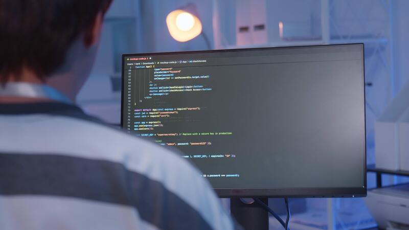 giovane maschio asiatico esso libero professionista programmatore e Tech ingegnere lavori con computer tastiera del computer, digitando Software codici per applicazione sviluppo e sito web Rete sistema informazione dati nel camera. Video Pro