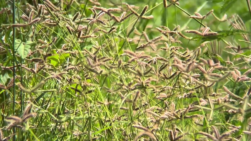 un' denso campo di selvaggio erba sormontato con numerose a forma di stella seme teste ondeggiante delicatamente. Video Pro