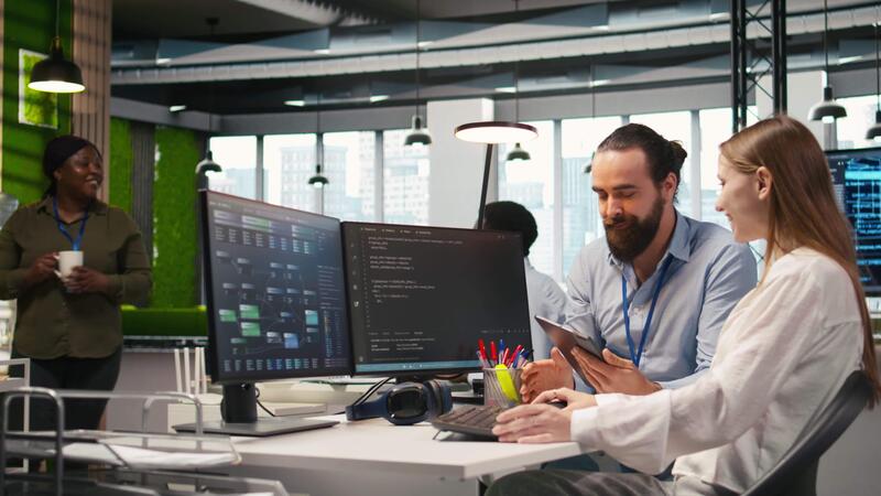 mentore insegnamento giovane dipendente per risolvere i problemi Software errori utilizzando ai. manager fare induzione per nuovo arrivato junior dev utilizzando computer per Scrivi codice, sviluppando macchina apprendimento api, telecamera un' Video Pro
