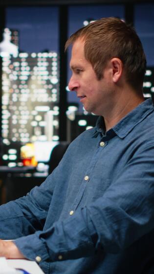 verticale ritratto di maschio ingegnere usi architettonico Software e progetti per 3d rendere di un' casa interno. programma consente per configure mobilia e design elementi per un' virtuale disposizione. telecamera b. Video Pro