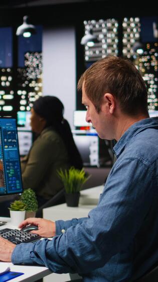 verticale diverso ingegneria squadra progettazione un' pavimento Piano su doppio monitor, utilizzando computer per interno design personalizzazione e resa. giovane colleghi uso interpretazione e rimodellamento. telecamera un. Video Pro
