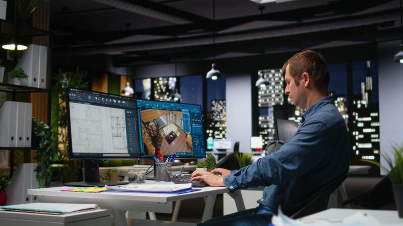 ritratto di ingegnere Lavorando su pavimento Piano interno design a computer, utilizzando architettonico Software e progetti per 3d rendere di casa interno. configure mobilia e elementi. telecamera un. Video Pro