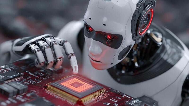 dinamico ai robot interagendo con luminoso microchip su Avanzate circuito asse, simboleggiante futuro tecnologia e innovazione Video Gratuito